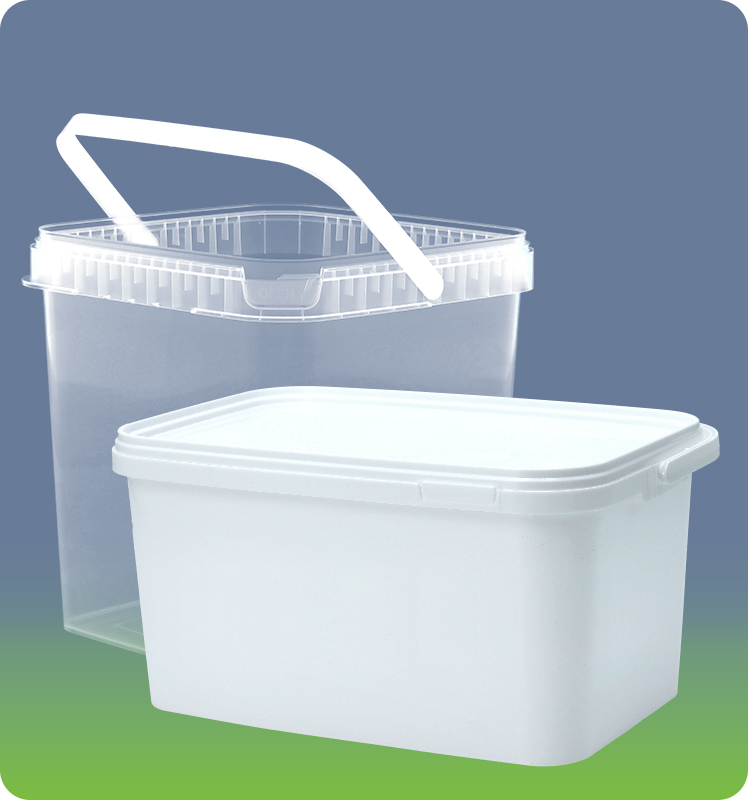 All square buckets are 100% recyclable, available in various sizes and designs and can also be decorated – for example with brilliant in-mold labels.